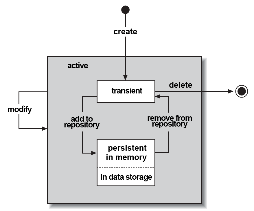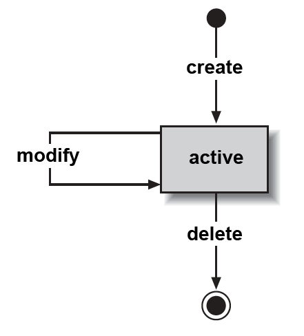 Since we model a domain with domain-driven design, which has a counterpart in the real world, the life cycle of objects in our program are very similar to the objects in the real world. Objects are created at a time, then they are active and can be changed, and eventually they will be deleted. This is shown in Figure 2-2.